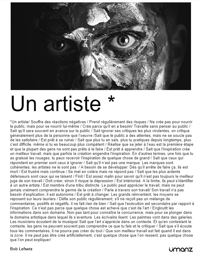 Il y a quelques semaines dans un texte mémorable, il a écrit ce qu’était un artiste. Une ode aux artistes et un texte percutant qu’il a accepté que nous traduisions et publions en Français sur Umanz qu’il en soit infiniment remercié :